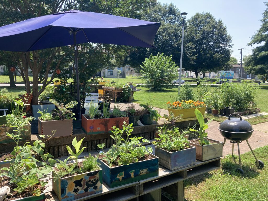 We held “Garden Club” for six months straight, every Sunday at 4:00—missing just one for Mother’s Day. Every month we went to the Housing Board meeting and showed all the great things we were doing, all the joy that came from even this little garden site. The in-ground beds are 6 ft by 10 ft each, with about 20 small container boxes sitting on the courtyard wall, plus a planter table—a tabletop built with 2x4s filled with soil so people who have a hard time bending down can still work with the plants.
