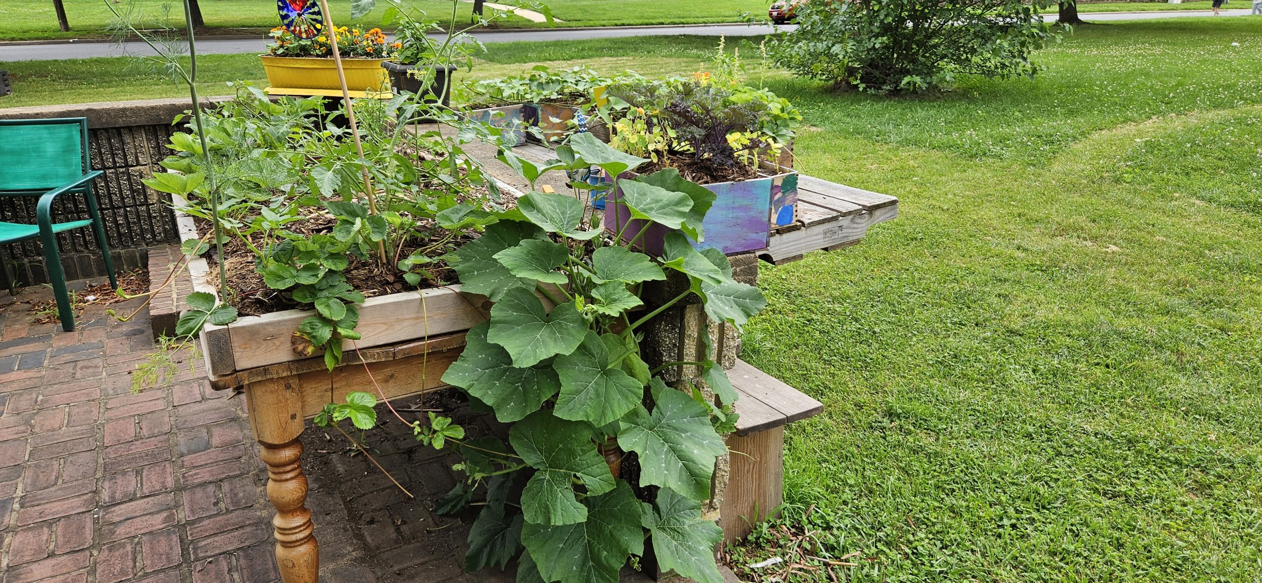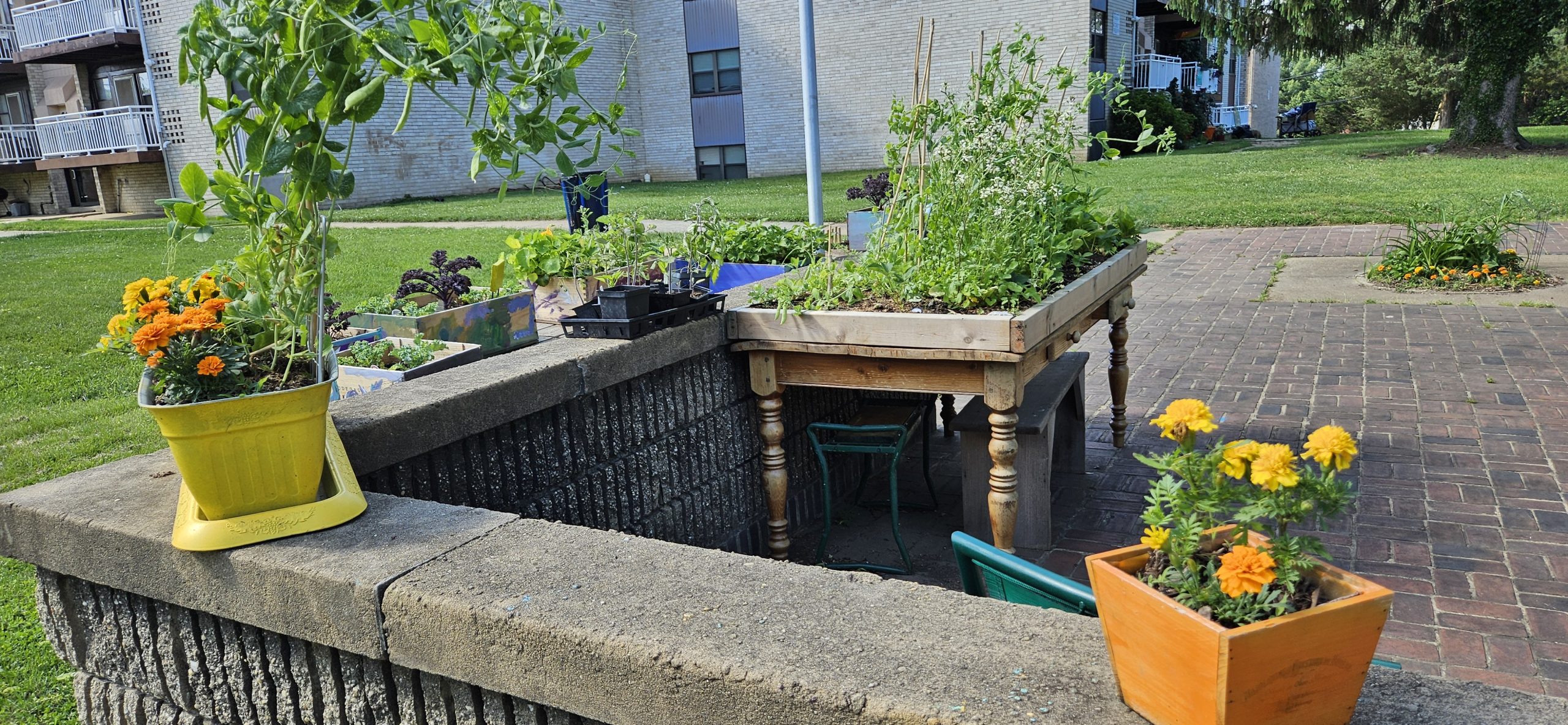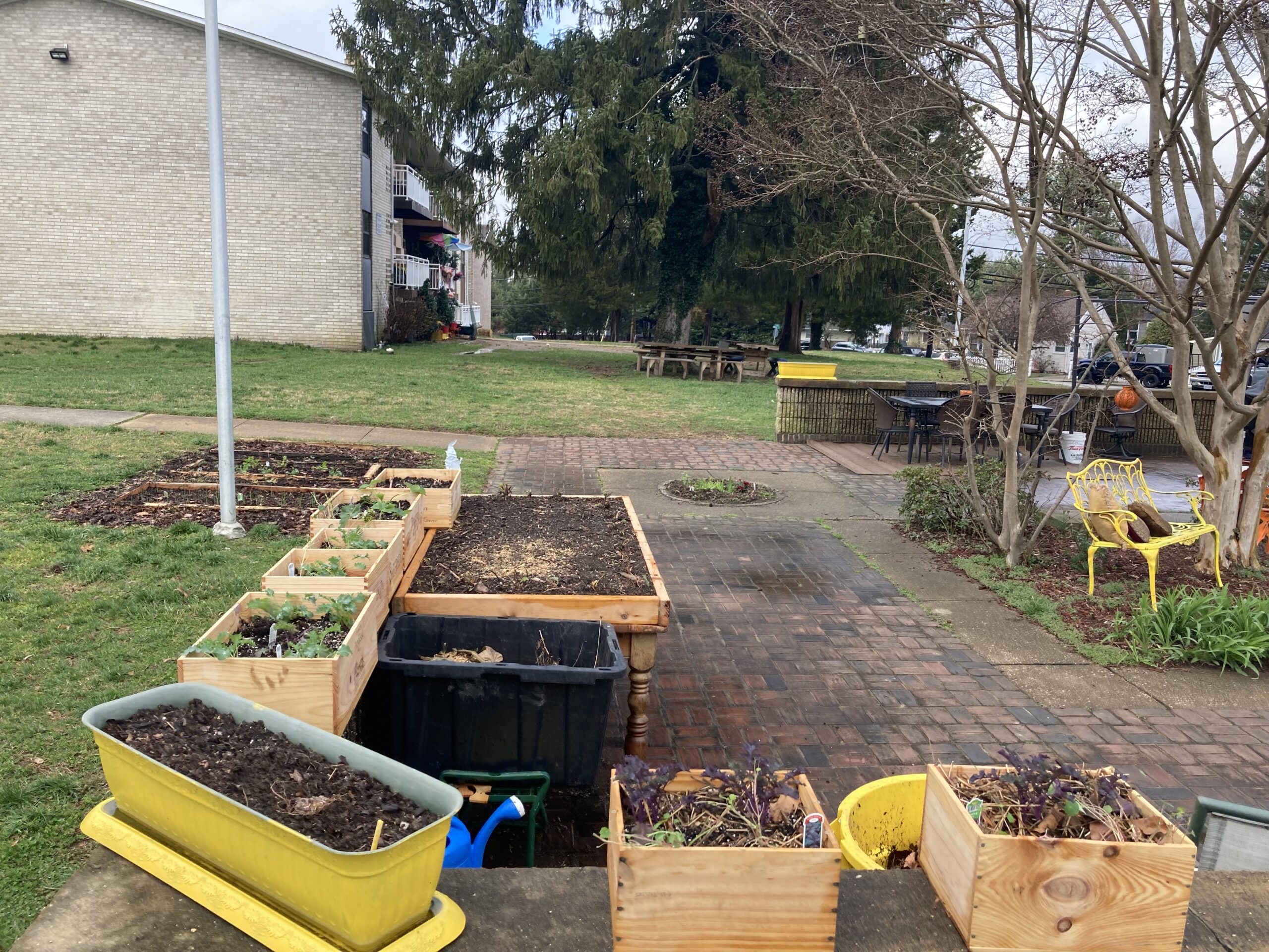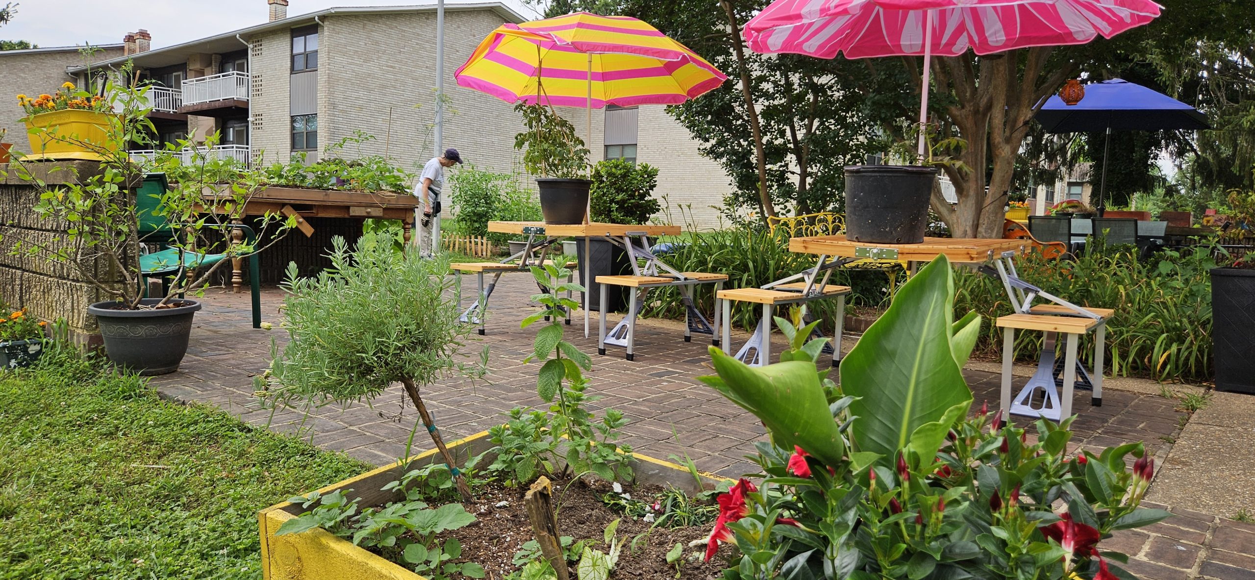 Created in March 2025, these three small beds (6 by 10ft footprint) and a collection of container plantings (including a planter table) produced hundreds of servings of fresh veggies, bringing pride and nourishment. This mini garden’s high impact shows the value of putting small, shared gardens on people’s doorsteps. The Healing Garden was especially impactful because it’s in a “high traffic area” and next to the courtyard, a highly used shared community space.