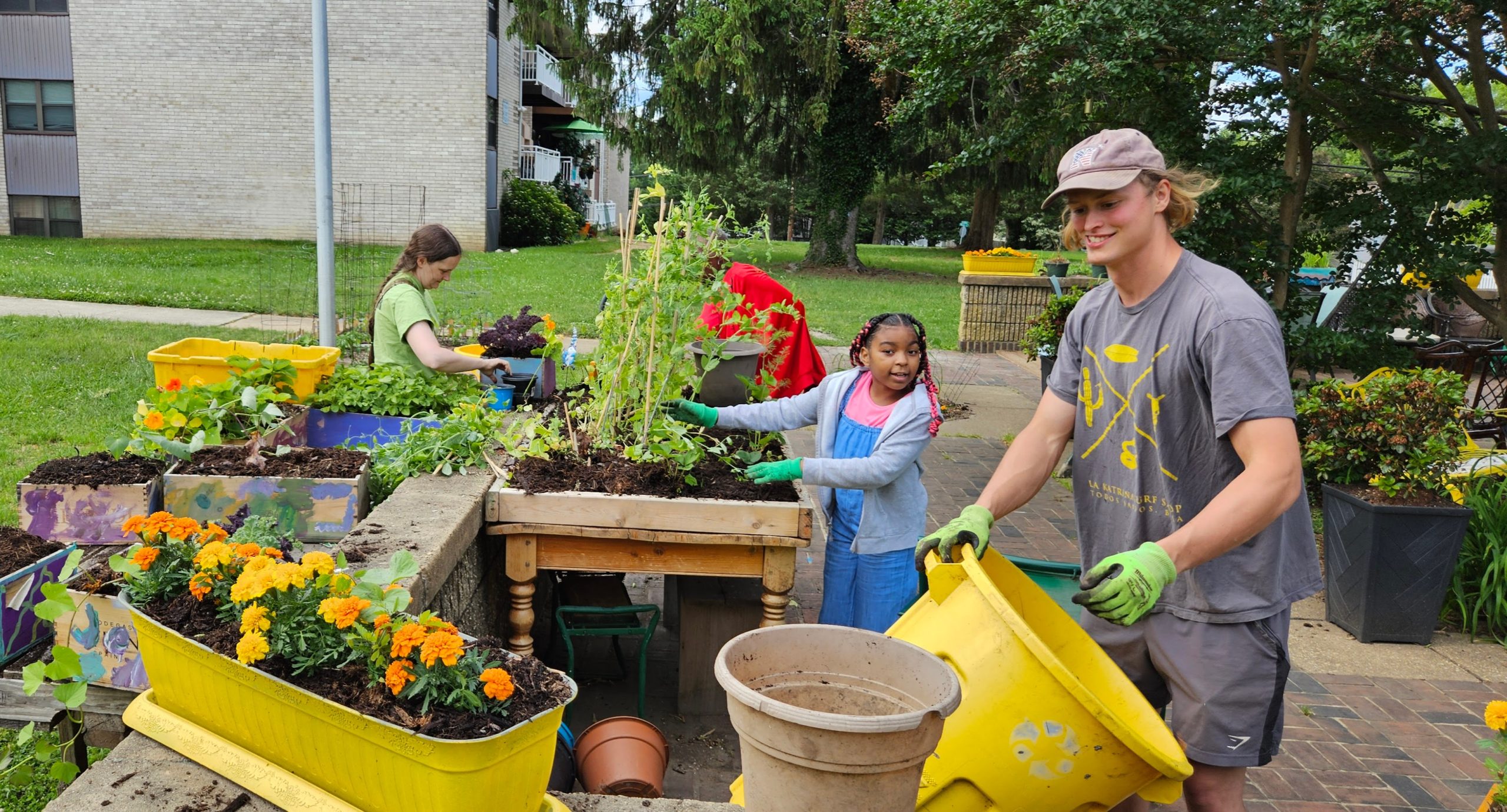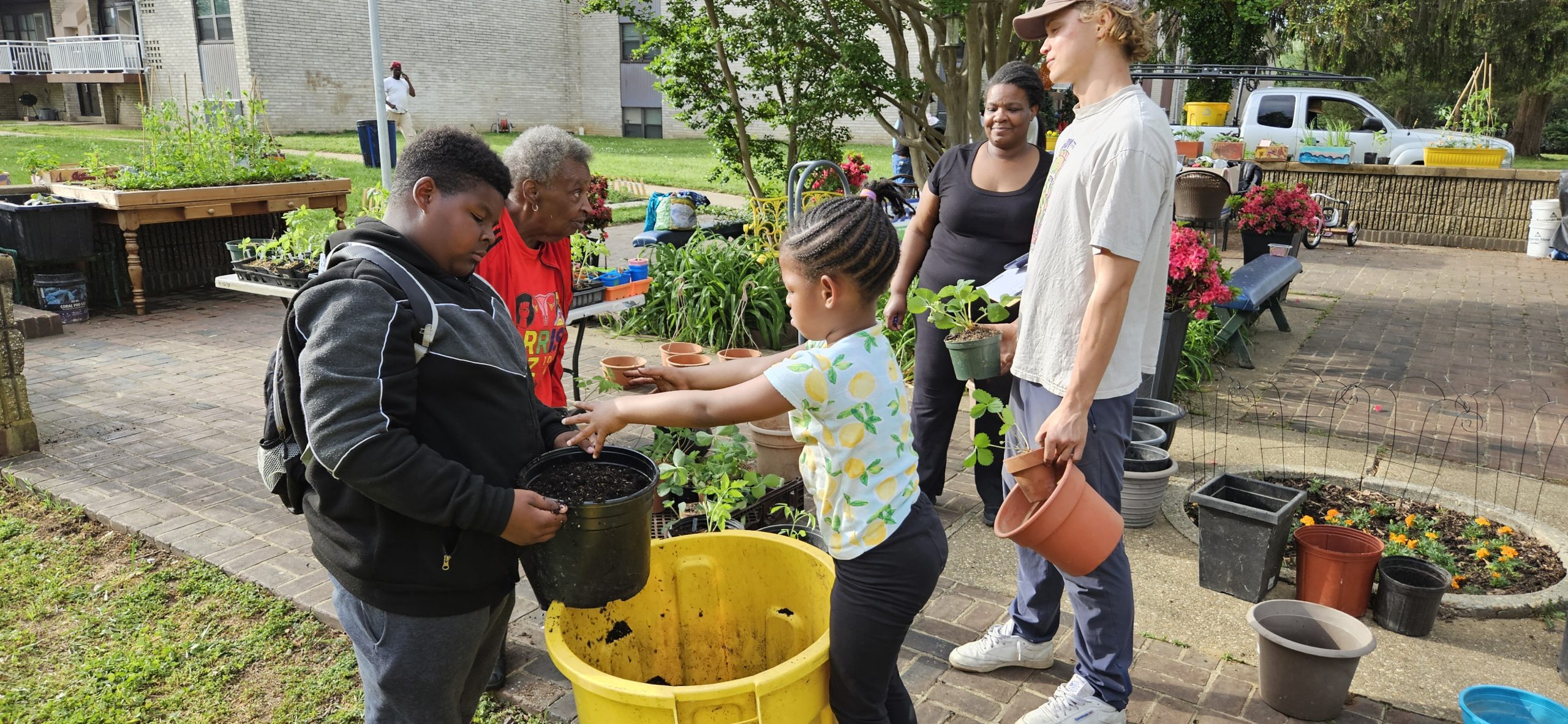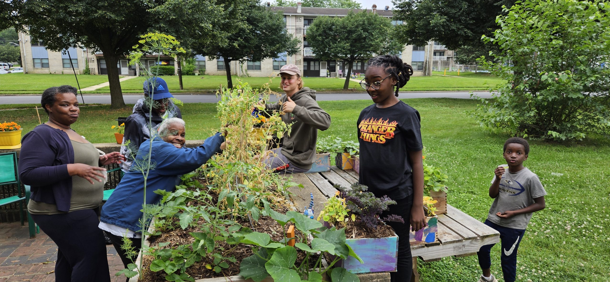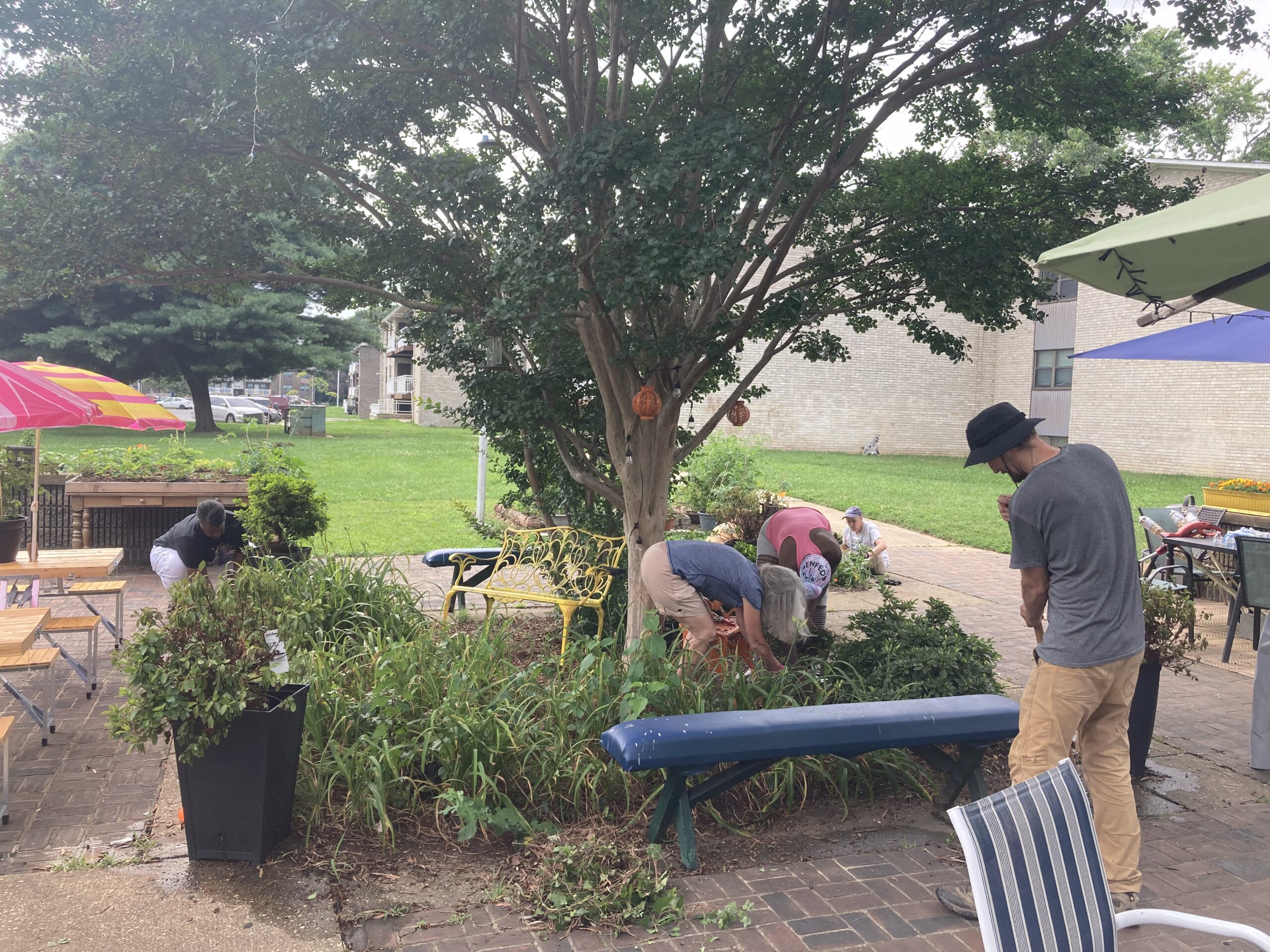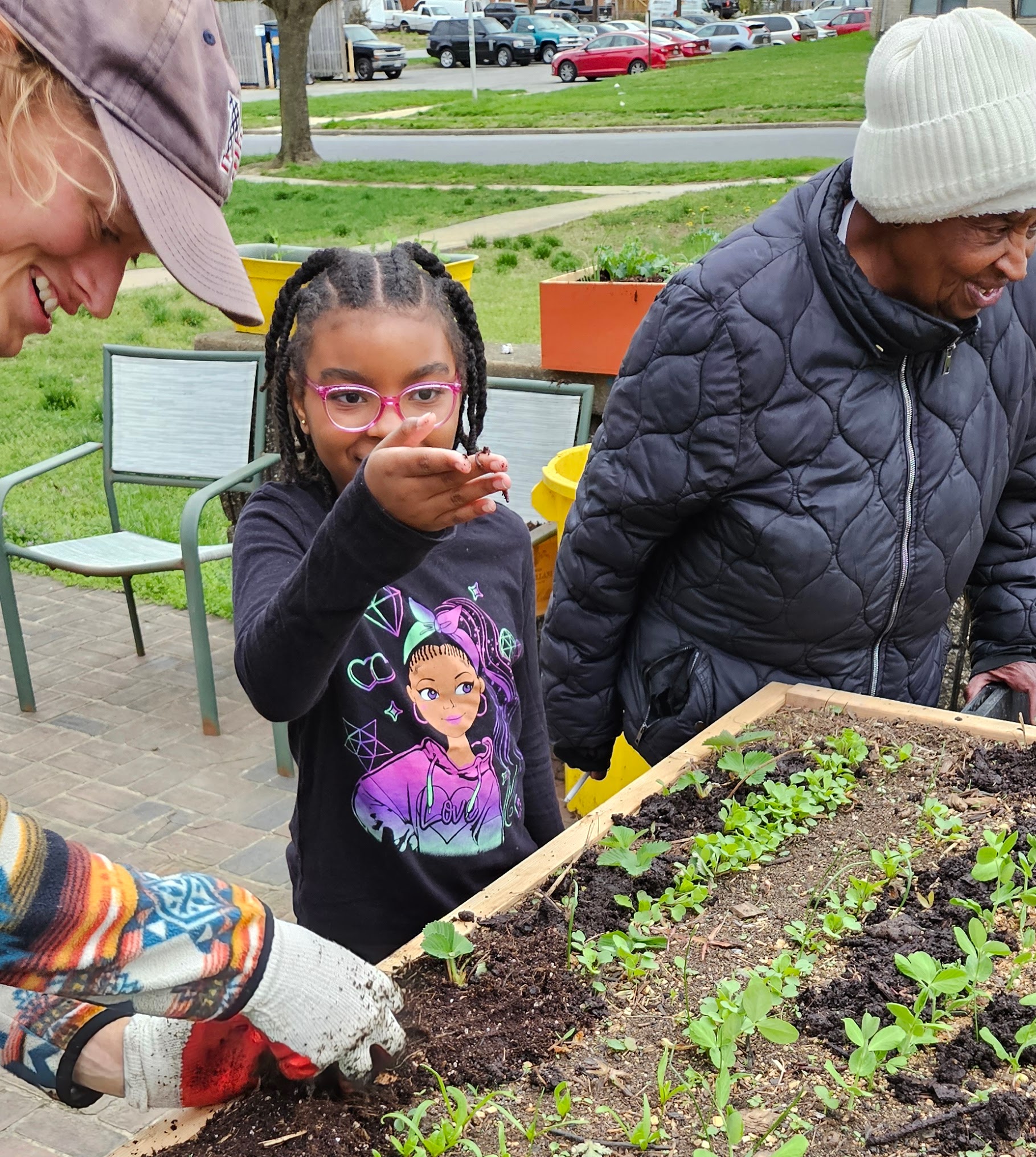 Created in March 2025, these three small beds (6 by 10ft footprint) and a collection of container plantings (including a planter table) produced hundreds of servings of fresh veggies, bringing pride and nourishment. This mini garden’s high impact shows the value of putting small, shared gardens on people’s doorsteps. The Healing Garden was especially impactful because it’s in a “high traffic area” and next to the courtyard, a highly used shared community space.